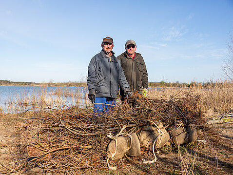 Das Gehölz für die verwendeten Totholzbündel stammt direkt von den Uferrandbereichen des Gewässers und ist im Zuge der Gehölzpflege zusammengetragen worden. Somit mussten keine großen Transportwege zurückgelegt werden, was die Logistik deutlich erleichterte.